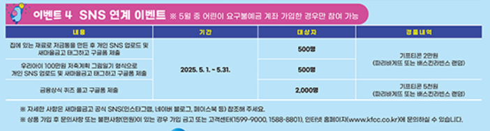 - 어린이 요구불계좌 신규 개설 이벤트: 5월 한 달 동안 계좌를 신규 개설하고,